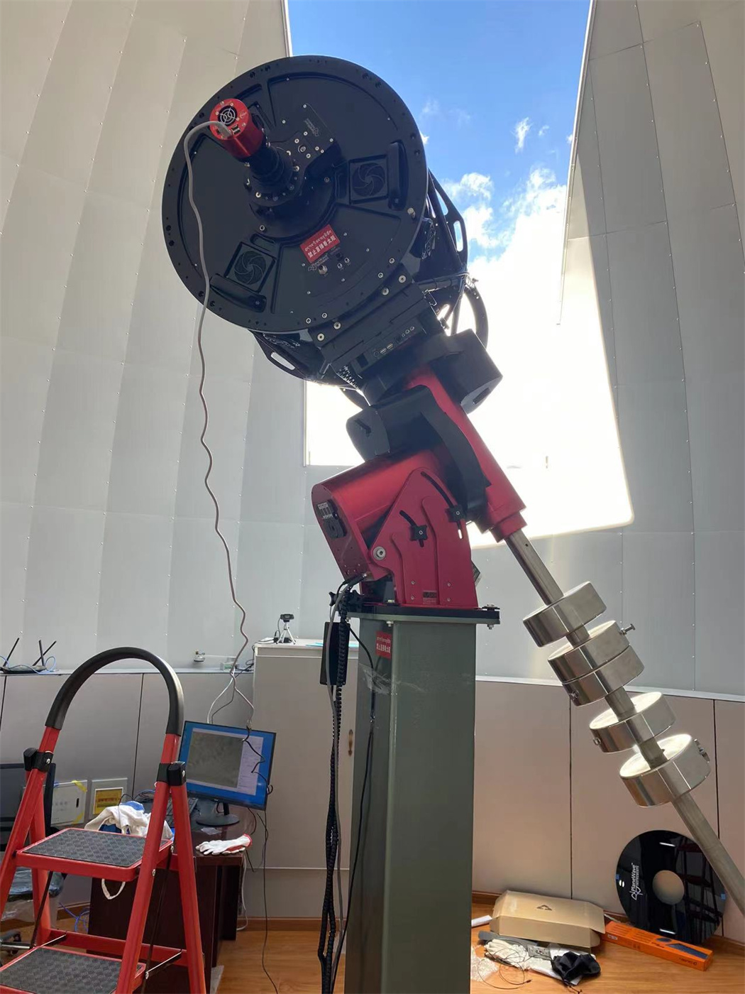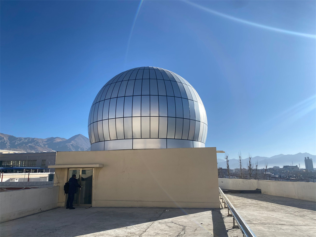 根據(jù)拉薩藏醫(yī)院天文臺使用要求,定制8米天文圓頂,經(jīng)典式樣。為了美觀以及耐用,外板采用1.2毫米銀灰色鋁板,內(nèi)板采用1毫米氧化鋁板,天窗使用暗藏式,天窗傳動為上下開啟式機械傳動,關(guān)起時是平的。為適應(yīng)拉薩地區(qū)夏天熱冬天冷的氣候現(xiàn)狀,我們創(chuàng)新地在天文夾層中添加加隔音隔熱棉,這樣圓頂內(nèi)溫度能相對穩(wěn)定。同時配置大口徑望遠(yuǎn)鏡及智能隨動裝置,可滿足全天域星空觀測。